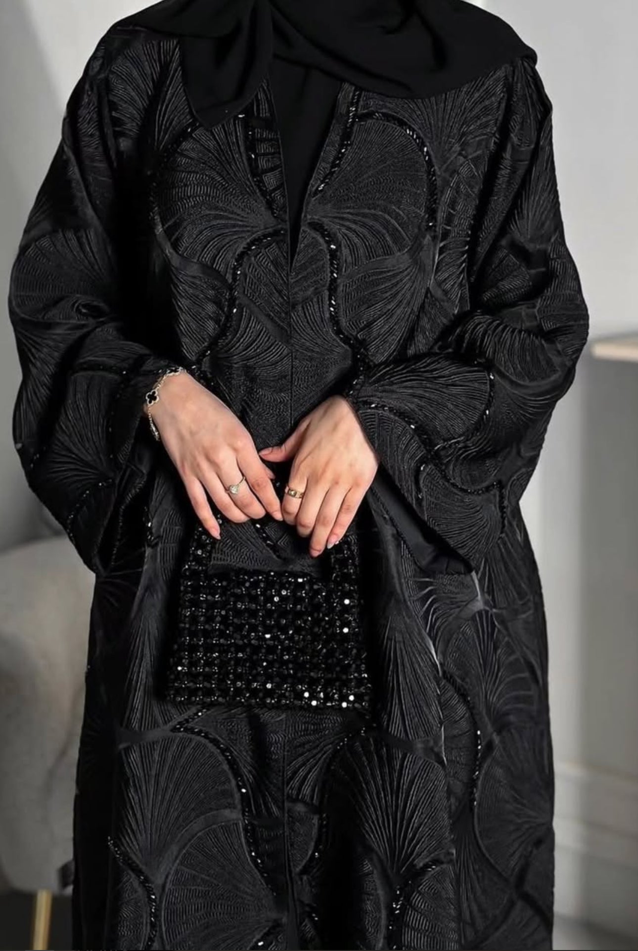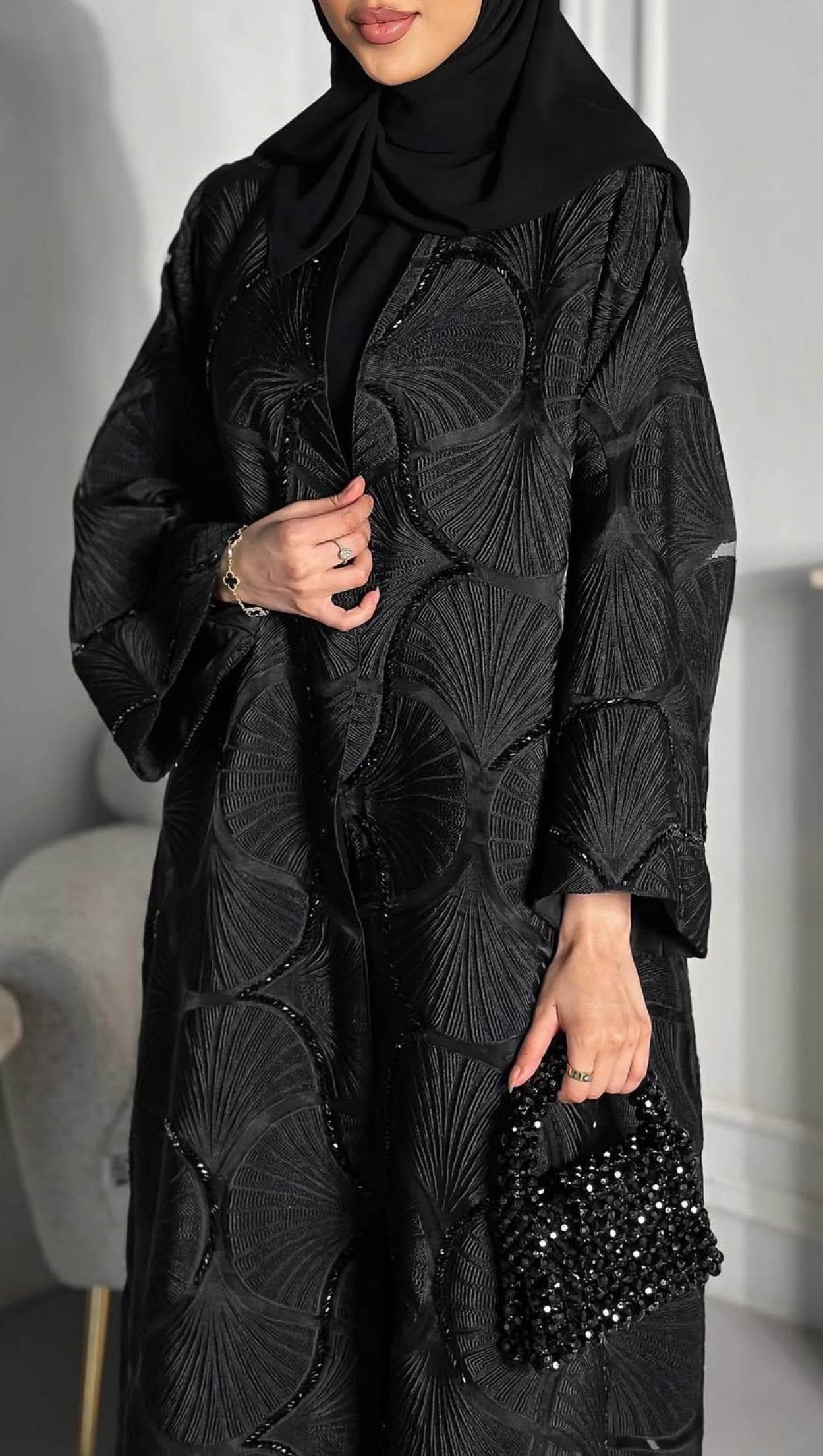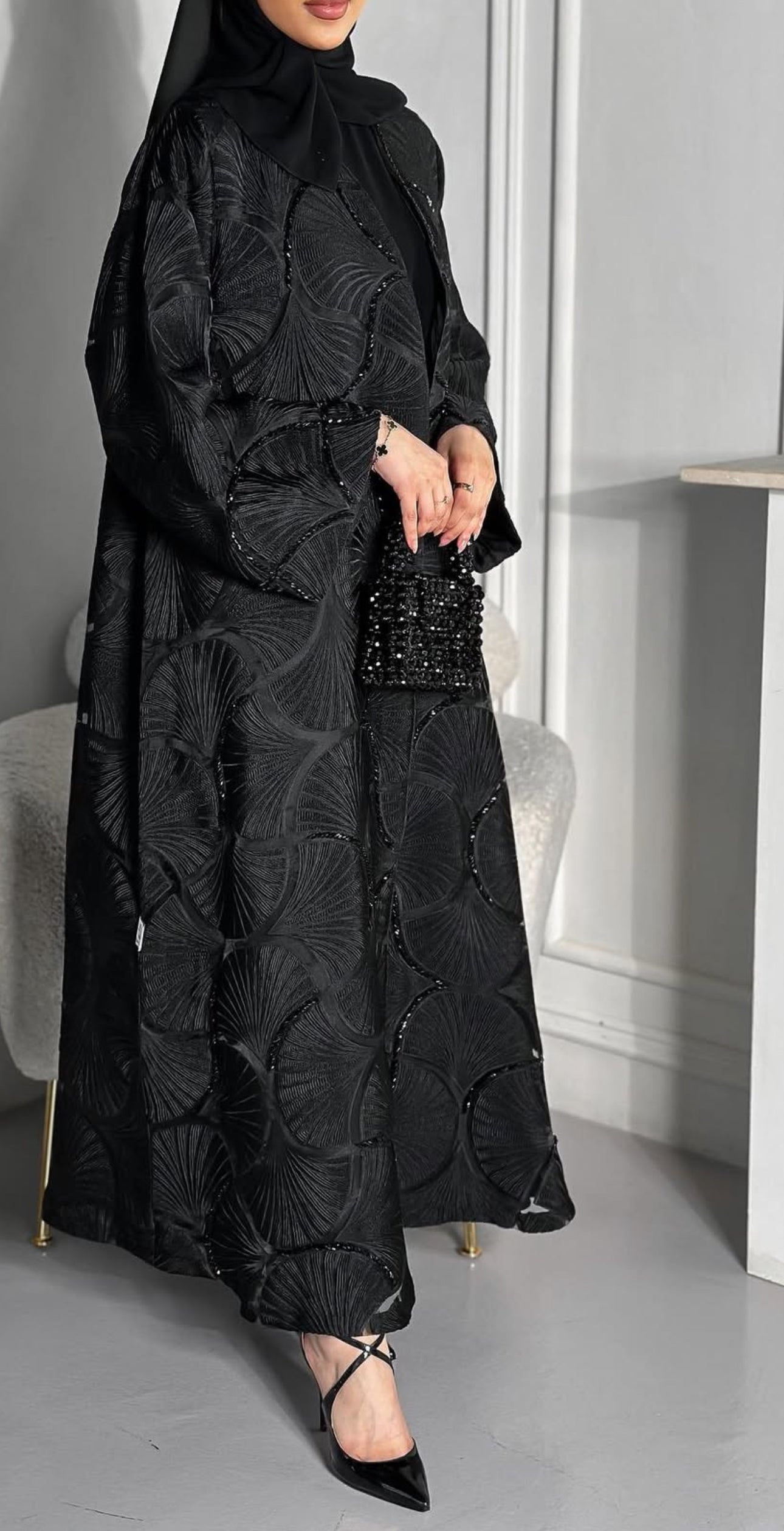 This exquisite black abaya is crafted from premium jacquard fabric featuring an elegant pearl shell design, meticulously handmade to ensure exceptional quality and detail. The intricate pattern of black pearl shells adds a subtle yet striking texture, enhancing the garment’s luxurious appeal. Designed for those who appreciate refined craftsmanship, this abaya offers a perfect blend of tradition and modern sophistication. Its breathable material provides comfort throughout the day, while the tailored fit ensures a graceful silhouette. Ideal for formal events or everyday elegance, this piece embodies timeless style and enduring durability.