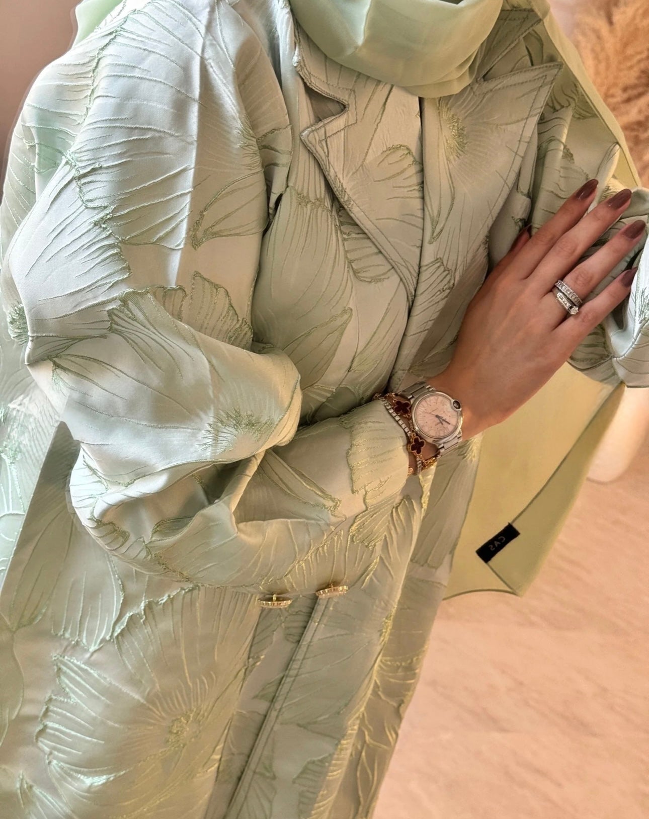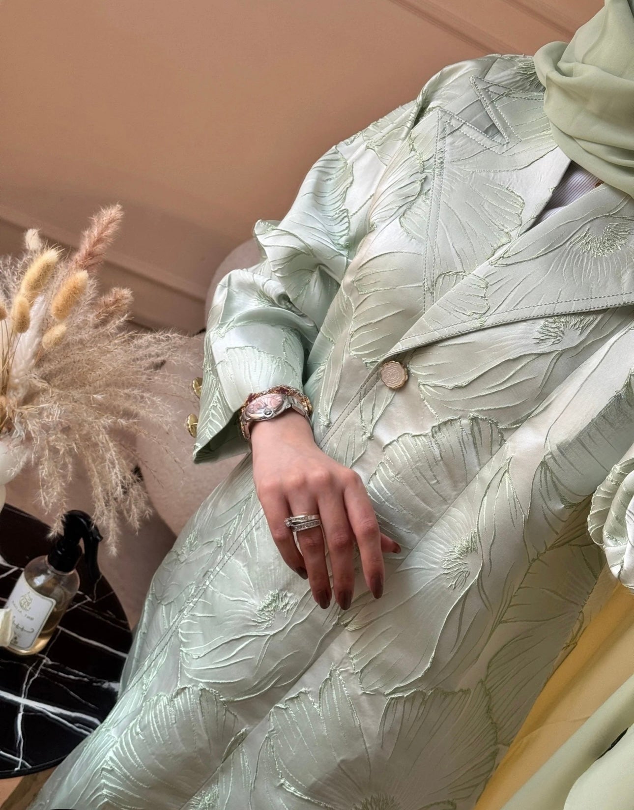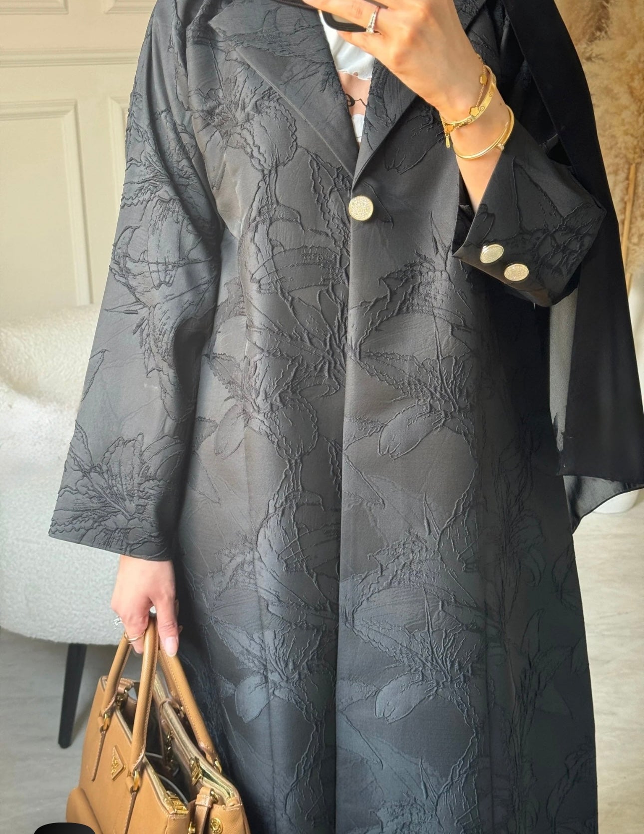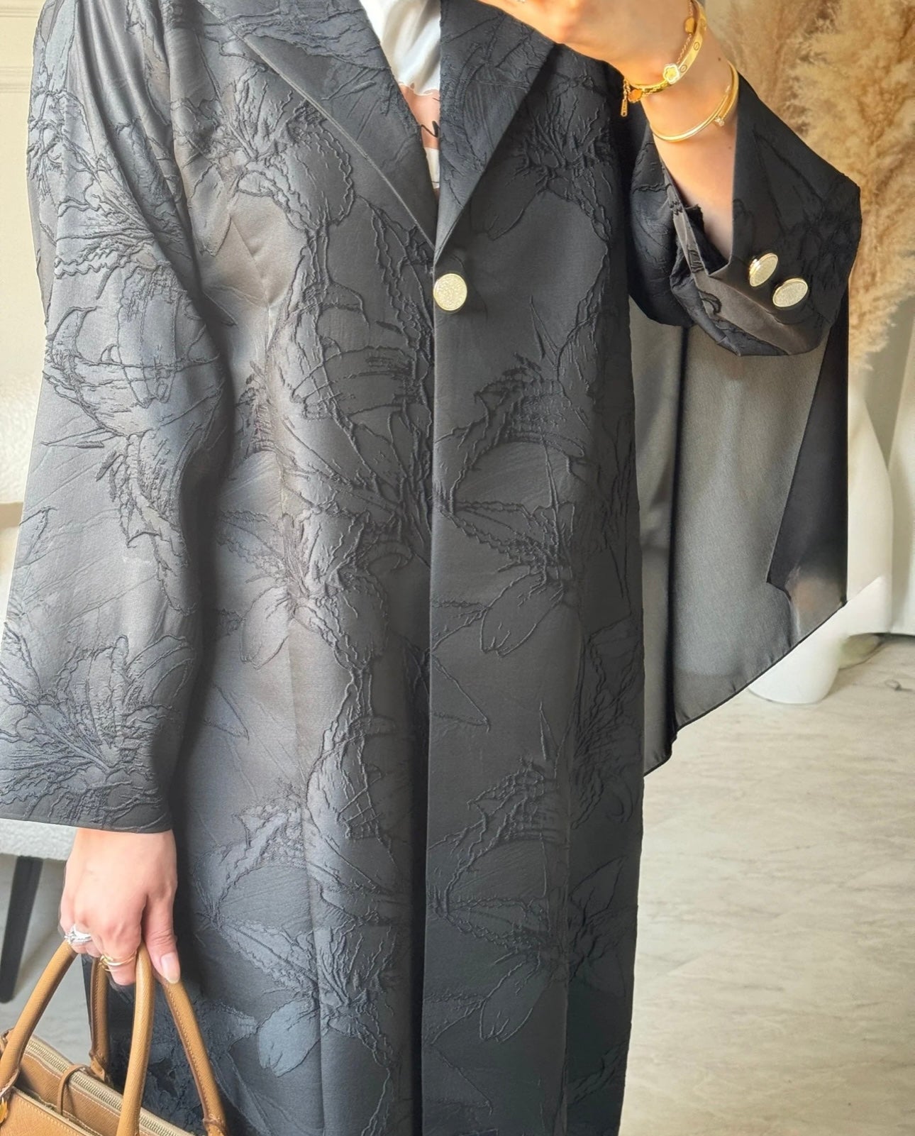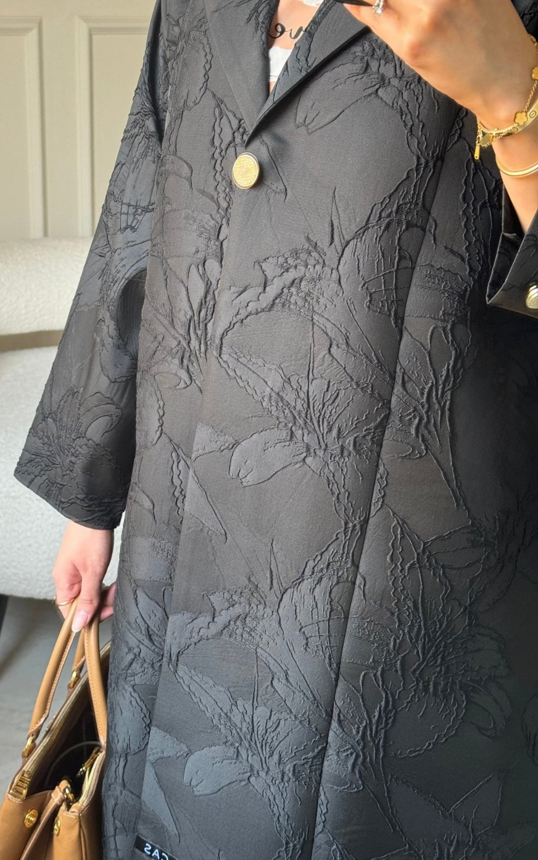 Jacquard masterpiece. Its subtle floral embossing and bold silhouette whisper of quiet power and royal refinement.